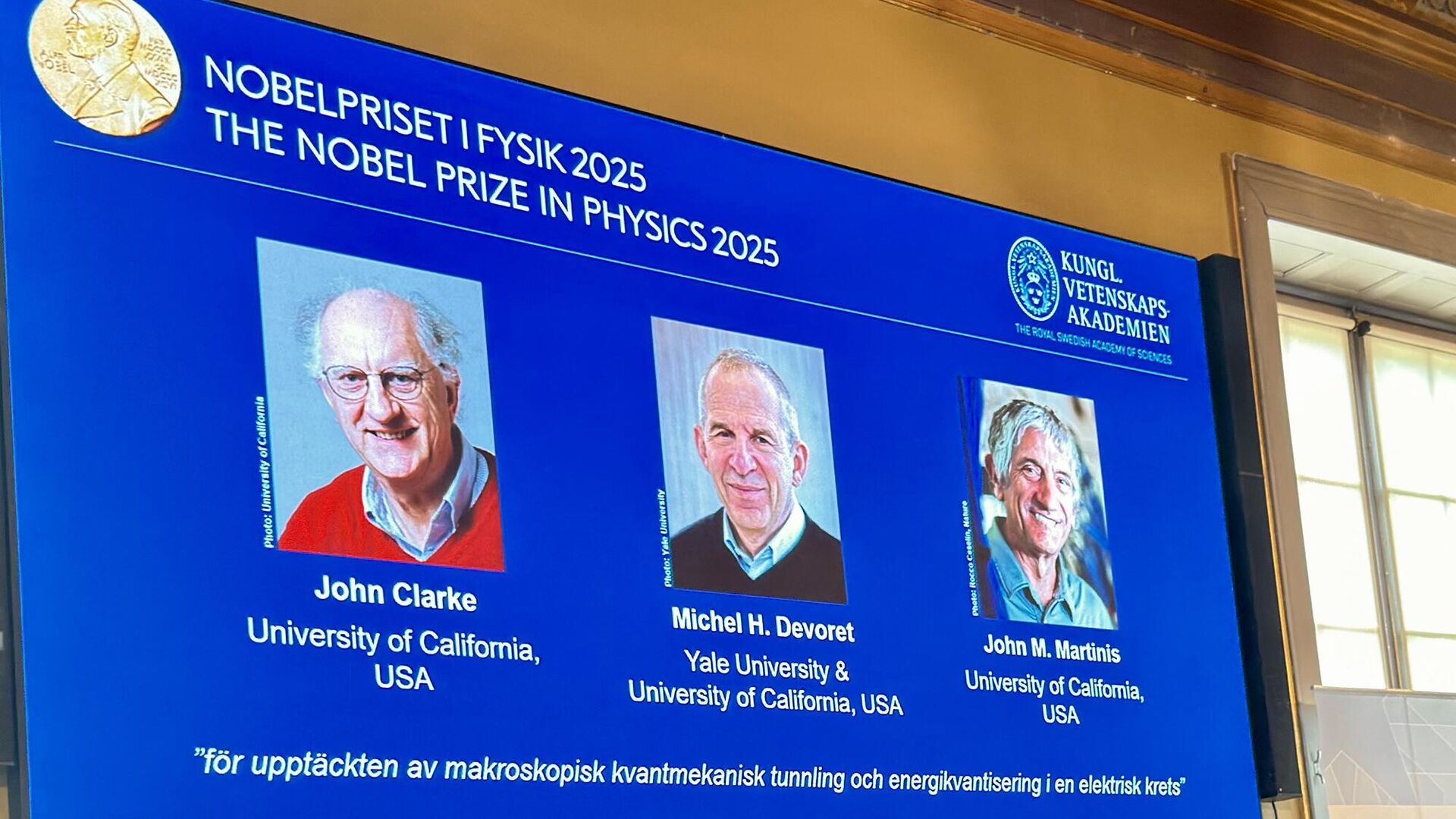 Премия была вручена Джону Кларку, Мишелю Деворе и Джону Мартинису за исследования в области макроскопического квантово-механического туннелирования и квантования энергии в электрической цепи. Эти открытия открывают новые перспективы для развития квантовых технологий, которые являются основой для цифровых технологий. Ученые провели серию экспериментов с электронной схемой из сверхпроводников, обнаружив, что частицы ведут себя как единая целостность, что соответствует принципам квантовой механики.